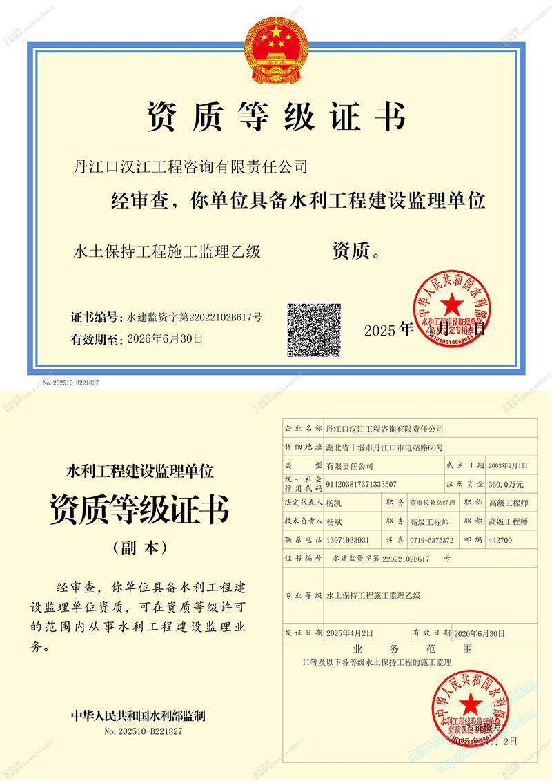 (原漢江綜合開發(fā)公司水利水電監(jiān)理中心)成立于 1989年3月,1993年6月經(jīng)水利部審批成為首批注冊監(jiān)理單位 (隸屬于長江水利委員會), 注冊資本 360萬元 。公司位于湖北省十堰市丹江口市電站路。公司目前擁有水利部頒發(fā)的 水利工程施工監(jiān)理甲級 、 水土保持工程施工監(jiān)理 乙 級 資質 ;住建部頒發(fā)的 房屋建筑 、 市政公用工程監(jiān)理 乙 級資質 。 可獨立承擔 各類水利水電工程 、 一般工業(yè)與民用建筑工程監(jiān)理 , 土地整治 , 招標代理 、 技術咨詢 等業(yè)務。公司實行董事會領導下的總經(jīng)理負責制,下設辦公室、經(jīng)營部、財務部、工程技術部等職能部門。……